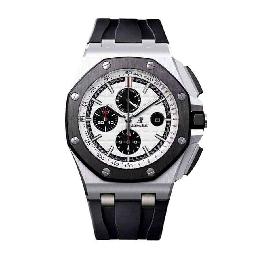 The Audemars Piguet Royal Oak Offshore Chronograph Ref. 26400SO.OO.A002CA.01 is a masterpiece of modern watchmaking, blending sporty aesthetics with high performance. The stainless steel case gives it a strong and durable build, while the black ceramic bezel adds a bold contrast and scratch resistance. The white dial, featuring the iconic “Méga Tapisserie” pattern, enhances its stylish appearance.