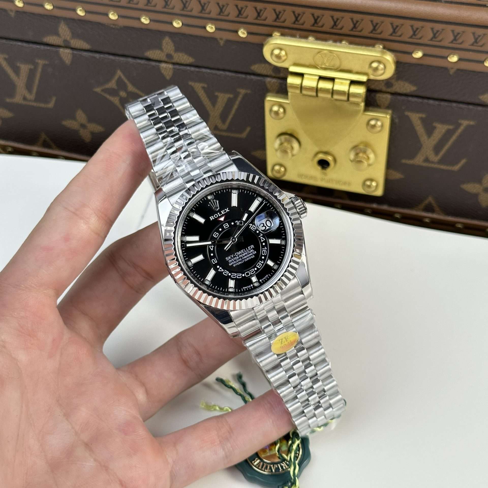 The Rolex Sky-Dweller 326935 with a green dial is a bold and elegant timepiece made for those who want both luxury and function. This 1:1 replica watch features a rich green dial with luminous markers, giving it a premium look that stands out. The signature fluted bezel and classic Oyster-style strap give the watch a sleek finish, perfect for any occasion.
