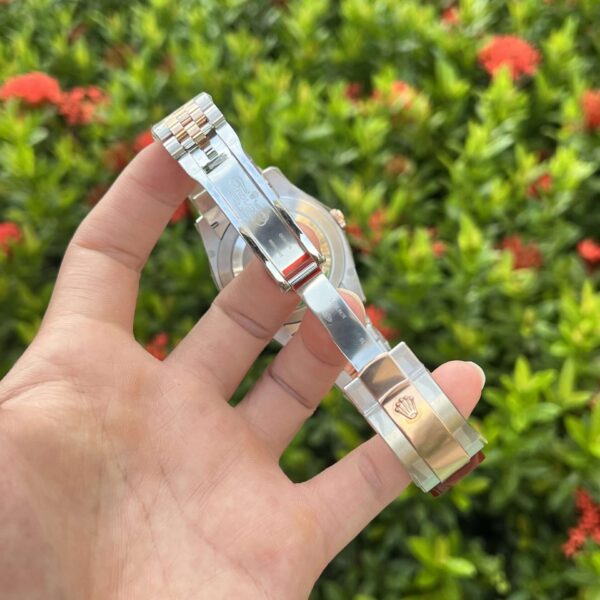 The Rolex DateJust Black Dial with Demi strap is a perfect fusion of luxury and functionality. Featuring a bold black dial, this watch exudes sophistication with its sleek and timeless design. The silver-tone markers and hands provide a strong contrast against the black background, making the time easy to read at a glance.