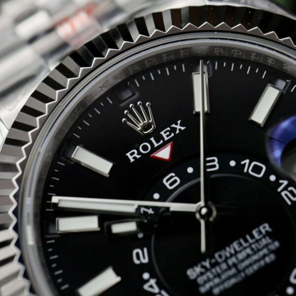 This 1:1 replica Rolex Sky-Dweller stands out with its sharp black dial and sleek Jubilee strap, giving it a bold yet elegant style. The 42mm case has a polished finish and classic fluted bezel that adds a luxury feel. It features automatic movement, dual time zone, and annual calendar – making it both stylish and useful for daily or travel wear.
